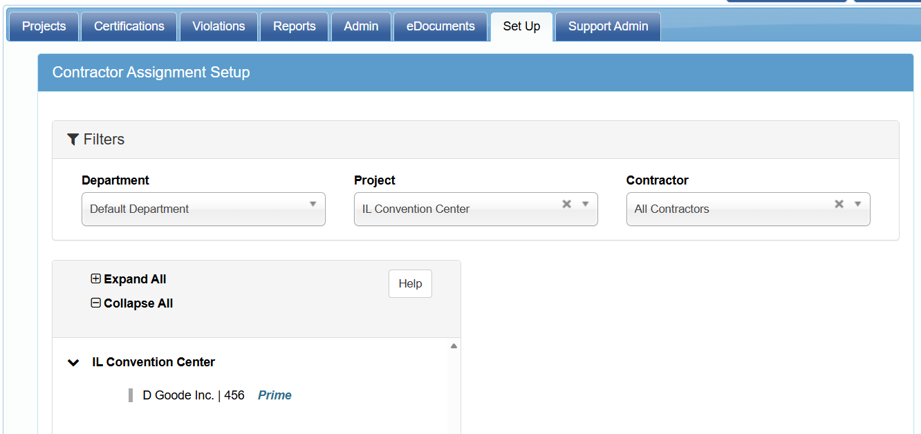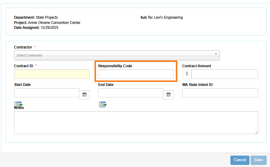 Preconditions: for this report to run correctly, you must enter a responsibility code when assigning a project. Set Up>Contractor Setup>Contractor assignment > Add new assignment.