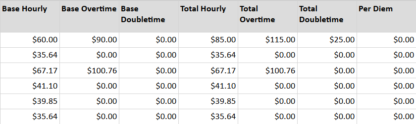 - Base Hourly Rate, Base Overtime Rate, Base Doubletime Rate