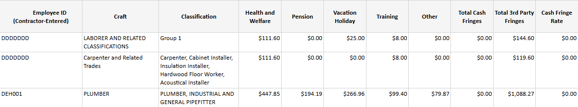 Report Description: this report gives you a breakdown of individual employees for the weekend date you specify with daily totals, by project and by contractor. This report will give total prevailing rates including both the hourly rates and the fringe rates. It shows the following information: