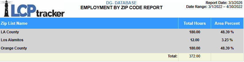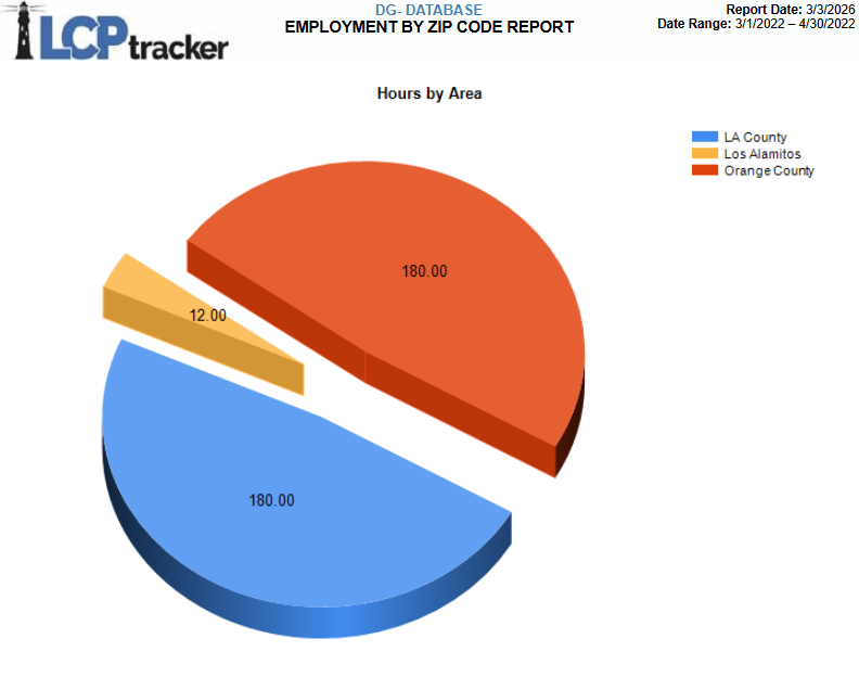 Report Description: this report breaks down total hours worked by employees residing in selected zip lists and gives a percentage of those hours vs total hours reported, all shown by a pie chart graphic. It contains the following information: