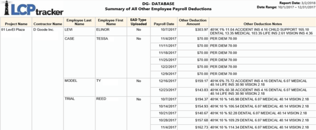 Report Description: this report pulls the other deductions notes for each employee by week end date for a specified date range. It contains the following information: