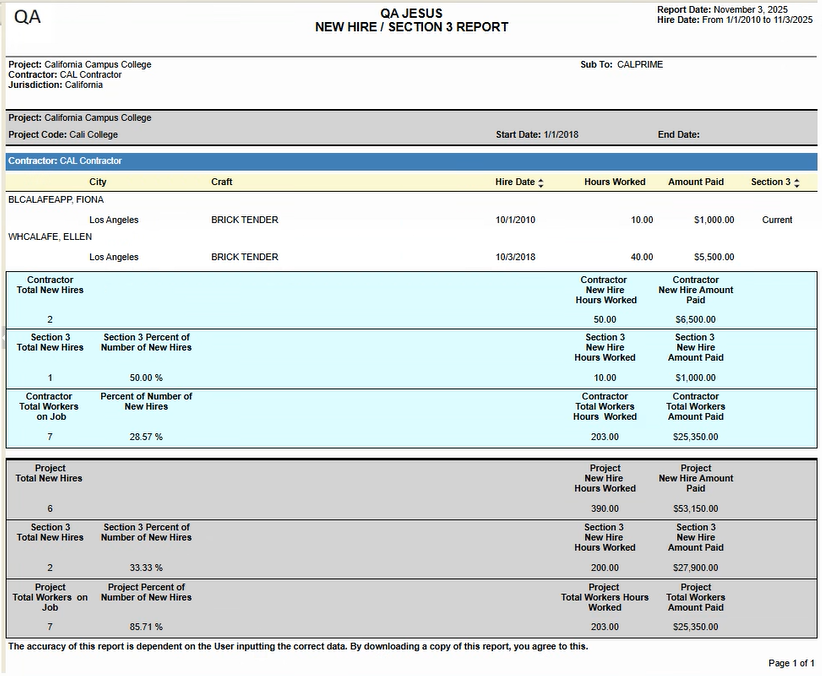 Preconditions: under Set Up > Add/Edit Projects an estimated start date must be entered for this report to run. If the new hire days (backend setting) is set to the default of 90 days, any employee with a hire date within the 90 days prior to the start date of the project, and then any time after the start date, will be considered a new hire on the project.