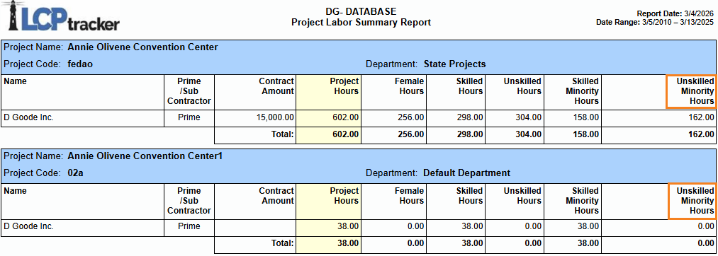 With combined Skilled/Unskilled minority Hours to Show Total Minority Hours as "False".