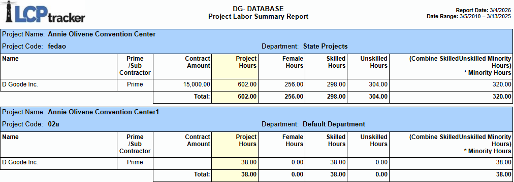 - Total minority hours worked, per contractor (this is a combination of skilled and unskilled hours).