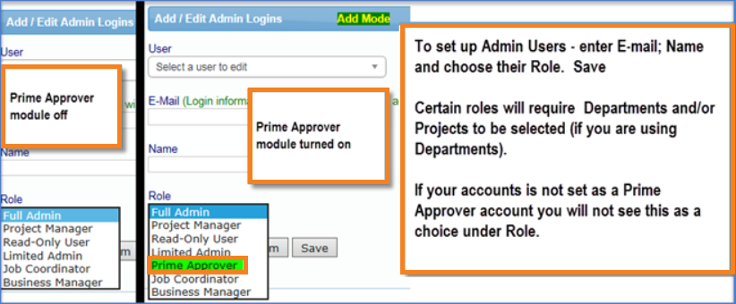 To enter an Admin user, you will go to Set Up>Add/Edit Admin Logins>Enter the users email address, name, and choose their role and save. For any other roles than Full Admin, you can assign a user to either all projects or you can limit their access down to a particular department or project(s).