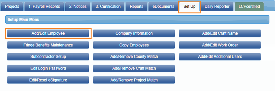 Para agregar un empleado al sistema o editar a alguien que ya está en el sistema, haga clic en Configurar y luego en Agregar/Editar empleado.