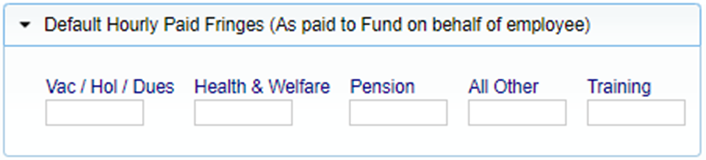 Esta sección se conoce como ahorro de tiempo. Es opcional rellenar las tarifas horarias de esta sección. Esto permitirá una facilidad de uso al ingresar los registros de nómina manualmente, ya que podrá hacer clic en el botón Calcular honorarios en la pantalla de Entrada de nómina, y el sistema realizará el cálculo matemático de las cantidades por hora multiplicadas por las horas trabajadas.