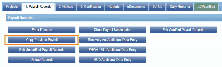 Esta opción solo está disponible si se ha completado previamente una semana de pago. En la pestaña Registros de pagos, haga clic en el botón Copiar pago anterior, seleccione el proyecto y, a continuación, seleccione el CPR que desea copiar.