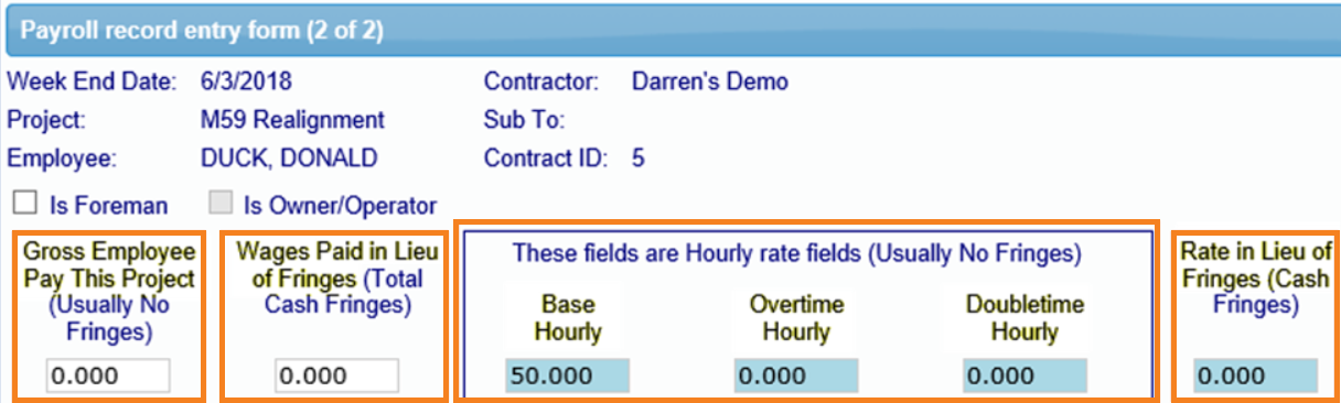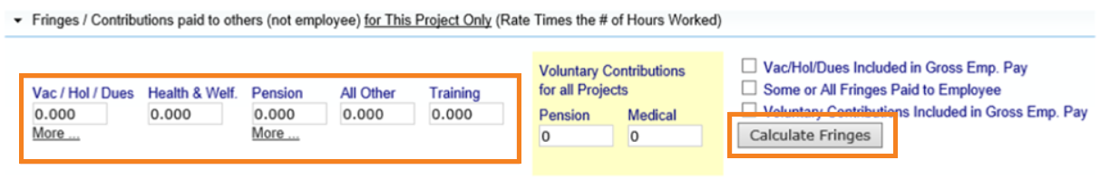 - Salarios Pagados en Lugar de Beneficios Complementarios – La cantidad pagada al empleado en lugar de los beneficios complementarios pagados a un plan, fondo o programa. Esta cantidad a veces se incluye en el Pago Bruto al Empleado en Este Proyecto dependiendo del sistema contable y los requisitos de informes de la agencia. (Si es un taller sindicalizado o no sindicalizado normalmente determina si paga estos beneficios requeridos a un plan, fondo o programa aprobado, o los paga directamente al empleado en efectivo). Esta cantidad sería la tarifa en lugar de los beneficios multiplicada por el número de horas trabajadas.