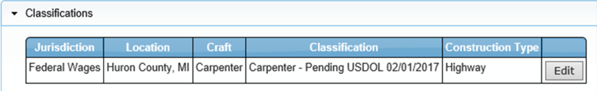 Esta sección lista la habilidad y clasificación en la que su empleado trabajó en su proyecto y por la cual se le pagará. Si por error eligió la clasificación incorrecta en la página de entrada original, puede cambiarla aquí haciendo clic en el botón Editar. (Recuerde que si su empleado trabajó en más de una clasificación durante esta semana laboral, deberá ingresar un registro de nómina separado para esa clasificación).