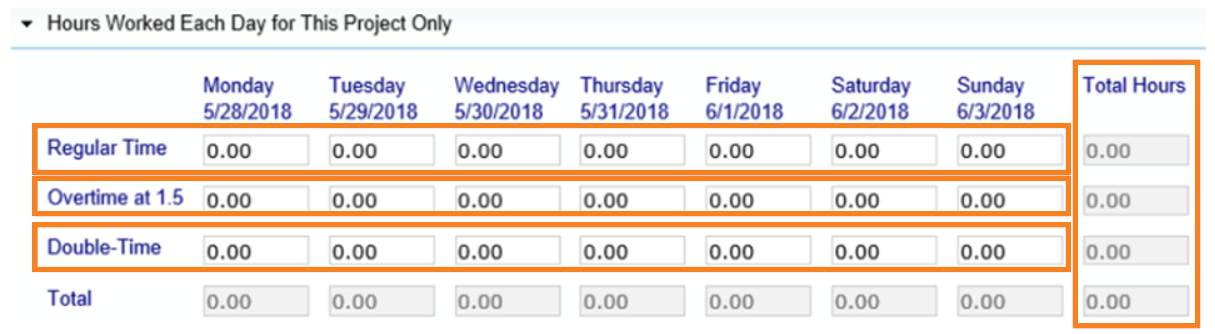 SOLO ingrese las horas trabajadas en este trabajo con salario prevaleciente para esta semana. El sistema sumará cada tipo de horas trabajadas, los días trabajados y la semana bajo la columna de horas totales.