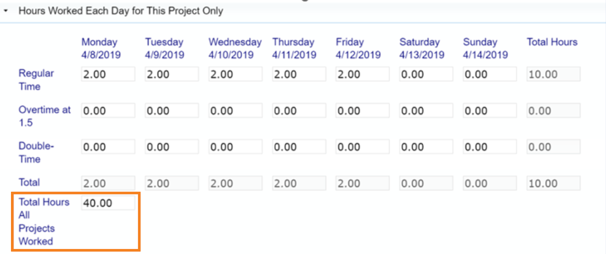 Nota: Si el Administrador lo habilita, puede ver un campo adicional llamado Total de horas trabajadas en todos los proyectos listado en la sección de horas. Si es así, este campo requerirá una entrada manual de las horas completas trabajadas por su empleado esa semana.