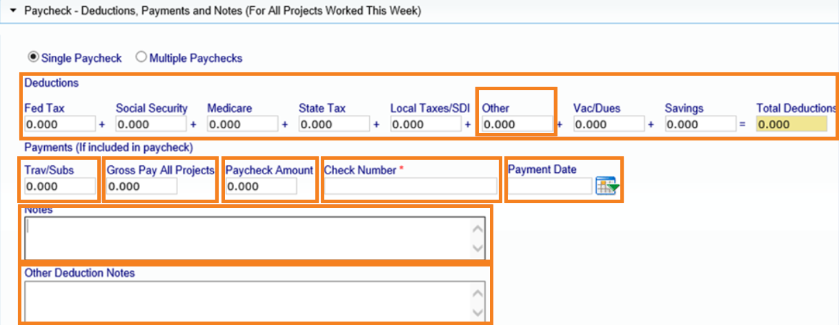Cualquier deducción que esté permitida según el USDOL o su Agencia (como embargos del IRS, manutención de los hijos, un préstamo de la empresa, etc.) se incluiría en la sección de "otras" deducciones. Cualquier cantidad que figure en "otros" dictará que se requieren "otras notas de deducción".