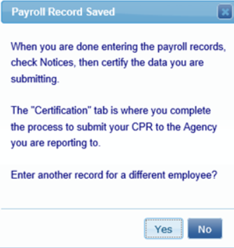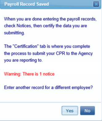 Si no recibe este mensaje, busque el mensaje de advertencia en ROJO en la pantalla. Es posible que tenga que desplazarse por el registro de nómina para ver lo que ha omitido, que puede ser un campo obligatorio.