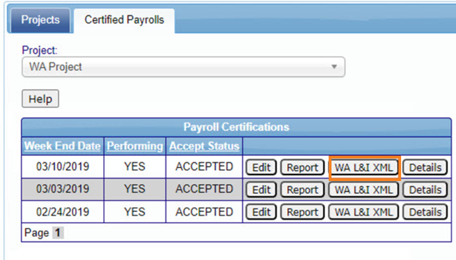 Desde enero de 2020, se requiere que los informes semanales de nómina certificada se presenten en línea ante el Departamento de Trabajo e Industrias del Estado de Washington, o WA L&I, al menos una vez al mes para todos los proyectos de obras públicas. Una vez que haya certificado su nómina, puede descargar el archivo XML de WA L&I para cargarlo.