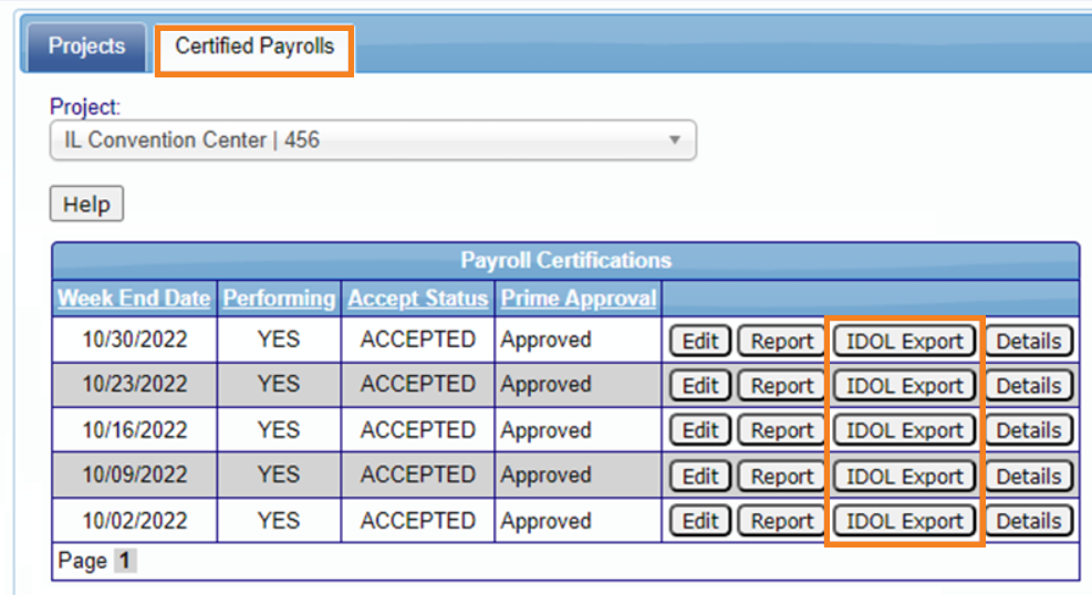 Desde septiembre de 2020, se requiere presentar informes semanales de nómina certificada en línea ante el Departamento de Trabajo de Illinois, o IDOL, antes del día 15 de cada mes para todos los proyectos de obras públicas financiados con fondos estatales. Una vez que hayas certificado tu nómina, puedes descargar el archivo XML del IL DOL para subirlo.
