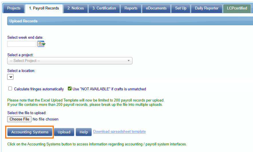 En la pestaña Registros de pago, haga clic en el botón Cargar registros, luego haga clic en el botón Sistemas de contabilidad.
