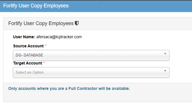 - All duplicate employees under the same Target Contractor are then removed from the list to be copied over. If either or both fields match, then the employee is not copied over. The system checks against: