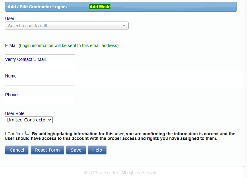 As a Contractor you can add additional users to your account. If you have an assistant or hire someone to help you, as the main user, you may go into LCPtracker and add your additional users.