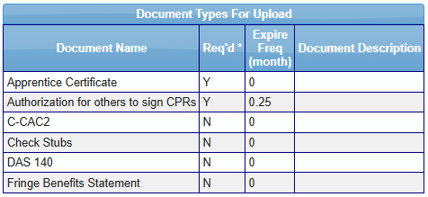 The Administrator specifies what documents are allowed/required to be uploaded. The list of documents will be shown in the Document Types for Upload table. Each document will have one of the following requirements set by the Administrator: