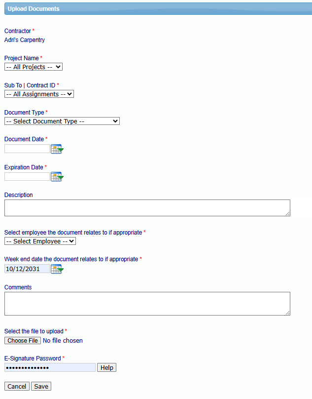 The Administrator may post documents in an editable Word or PDF format to allow the Contractor to Save to their computer, fill in the proper fields, re-save and then upload the completed document under Upload Documents.