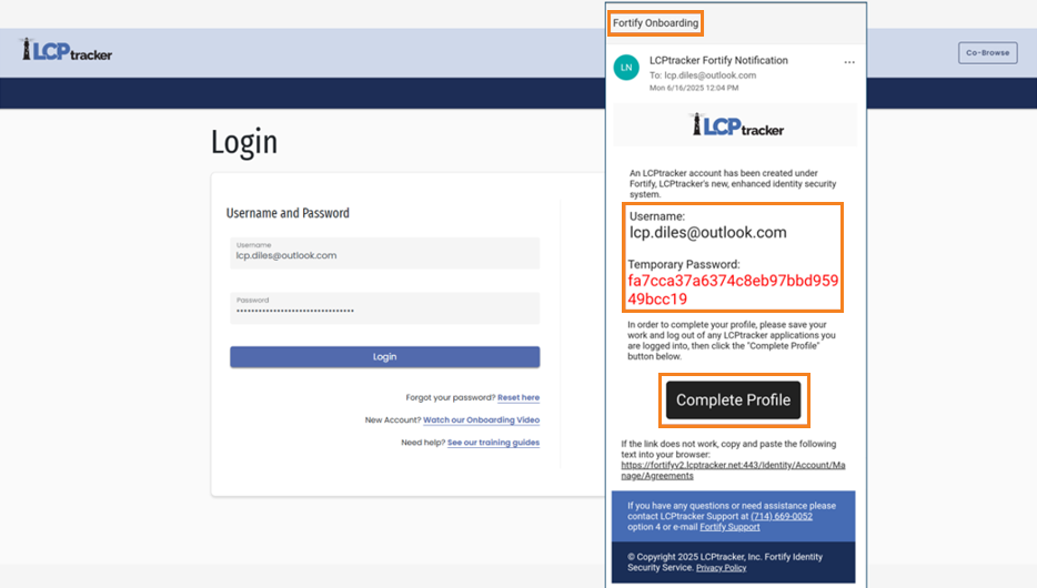 Cuando un usuario es invitado por un usuario de nivel elevado de un producto LCPtracker, este recibirá un correo electrónico de bienvenida de Fortify en Ingles con asunto: Welcome y un correo electrónico de incorporación con asunto: Onboarding, que le pedirá que complete su perfil en Fortify haciendo clic en Complete Profile mediante la página de incorporación Onboarding.