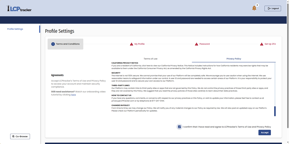 Step 1. Users must check the box to accept the LCPtracker Terms of Use and Privacy Policy.