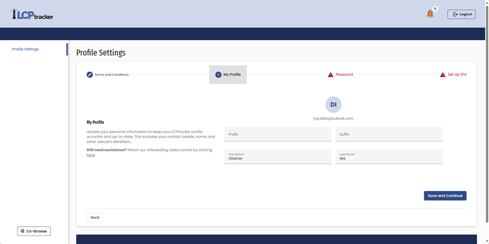 Select the Complete Profile option; this will direct you to the LCPtracker User Portal login screen.