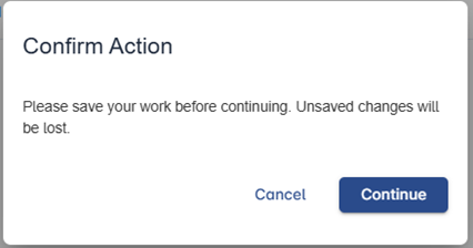 - Clicking on My Account button displays a confirmation window to remember to save changes to the platform saying “Please save your work before continuing. Unsaved changes will be lost” to avoid data loss.
