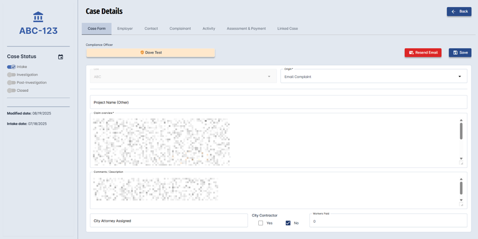 The “Violation Summary” field appears on the case list table (landing page) and should clearly describe the specific law, ordinance, or labor code that was violated. This may include formal references—such as “Section 15.672, Part C”—or a summary of the issue, like “Apprentices were found working without a journeyperson on site” or “The complainant reported being underpaid for the past seven months.” This field helps users quickly understand the nature of each case briefly.