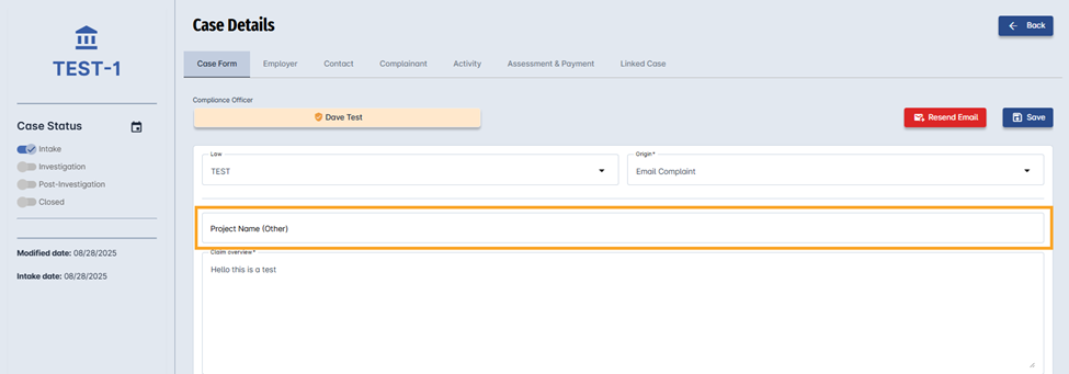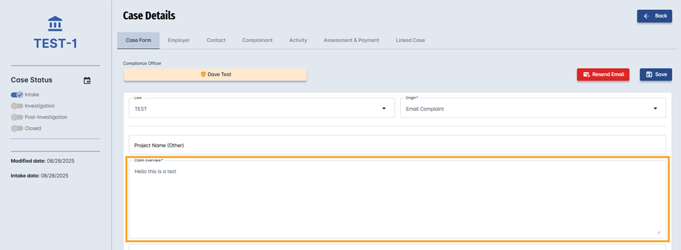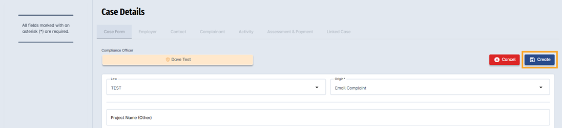 A new form will appear. Fill in the required fields (Law, Origin, and Claim Overview) and create the record before proceeding to other case components. The Compliance Officer field will automatically display your name based on the logged-in user. Upon creating an intake form, the status will automatically set to Intake.