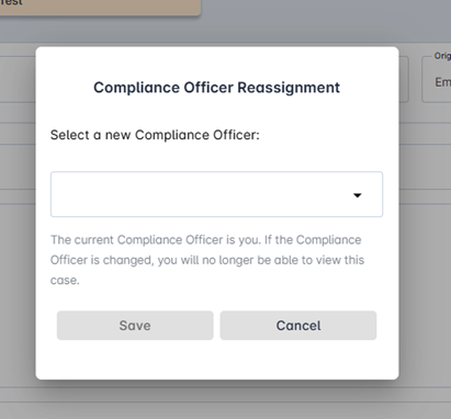 - The Compliance officer is initially set to the case creator and can be reassigned by a Moderator or Owner if needed.