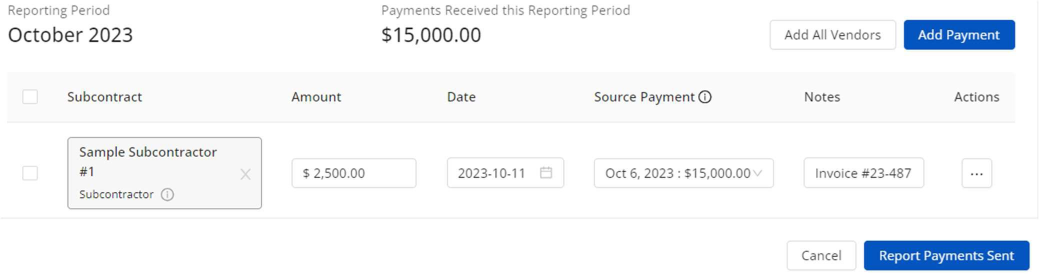 - Enter the Amount, Date, Source Payment, and Notes for each subvendor listed, then click “Report Payments Sent”. See important payment reporting notes/tips below: