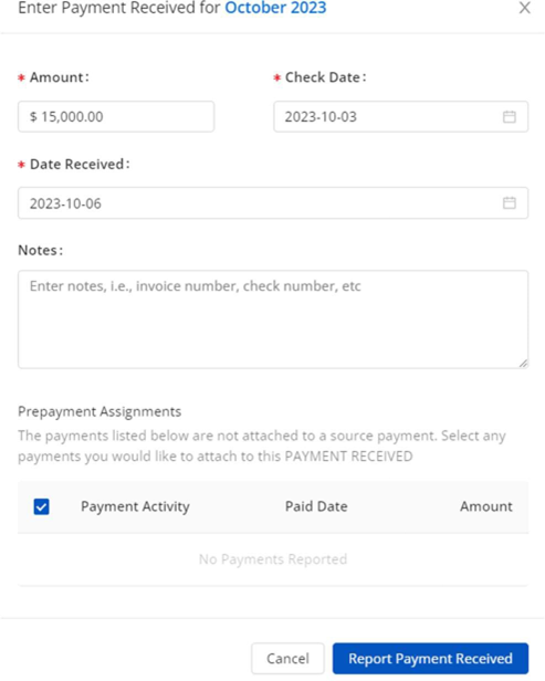 - Enter the Amount, Check Date, Date Received, and Notes for the Payment then click “Report Payment Received”.
