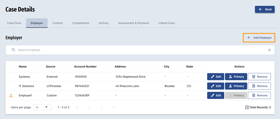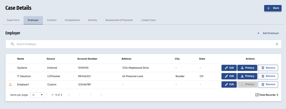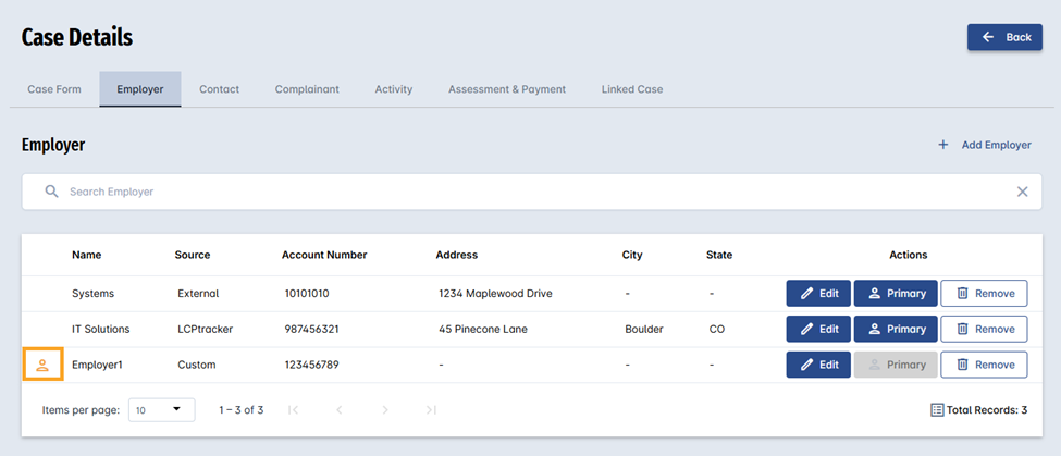 - Primary Employer Identification: Only one employer can be designated as the Primary Employer for each case. This employer is marked with a special icon to distinguish them from others.