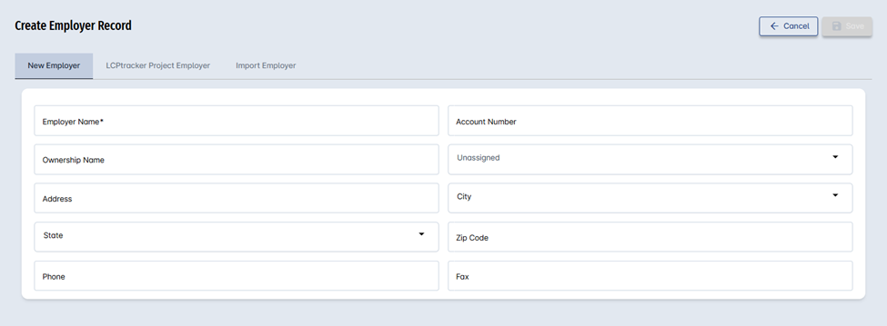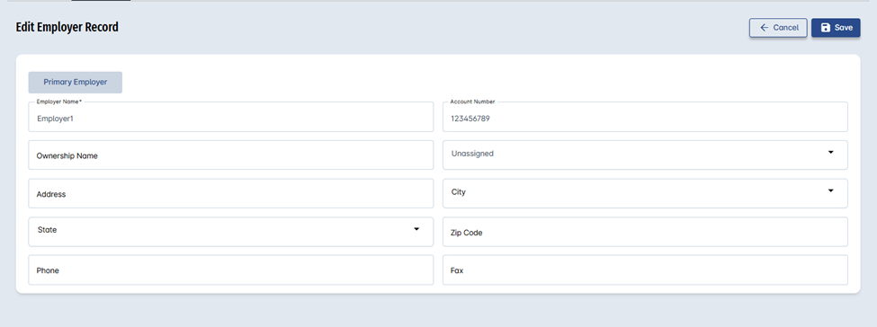 In addition, there will be two action buttons available in the upper right corner: Cancel, to discard any changes and return to the Employer main list, and Save, to apply and save the modifications made by the user.