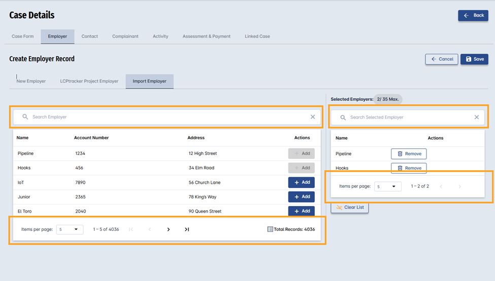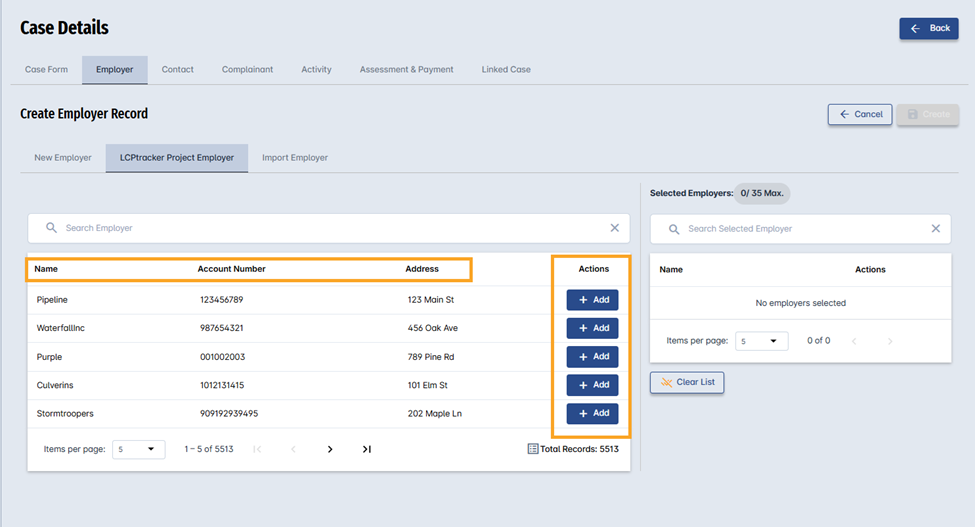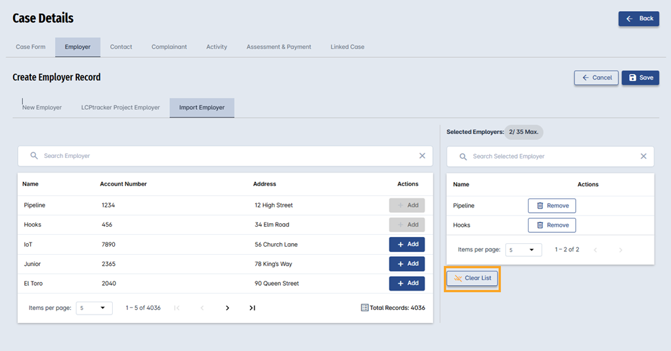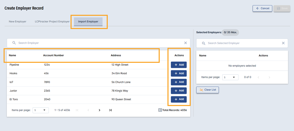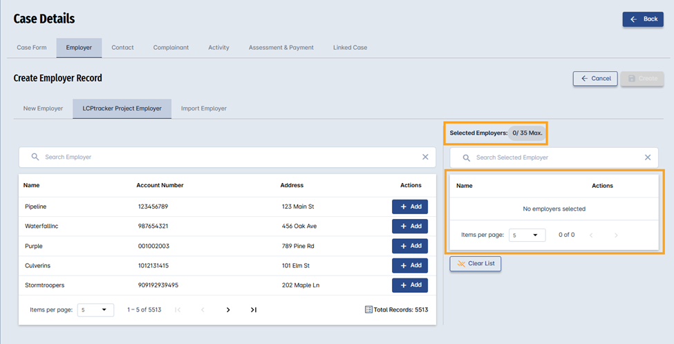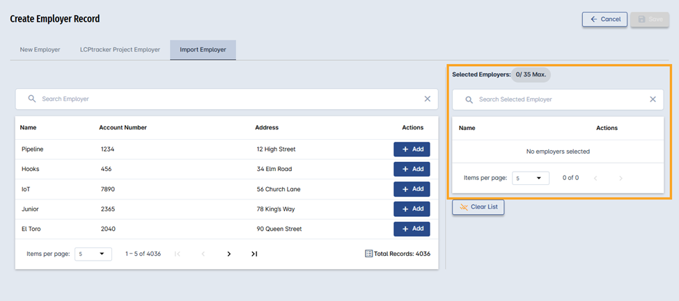Next to this list, a sub-list shows the Employers that have already been selected. Users can select up to 35 records per addition process.