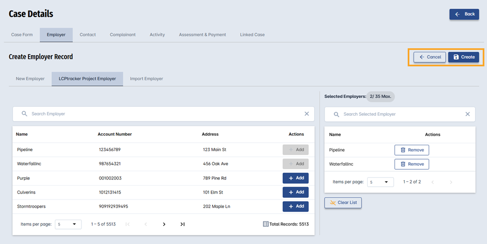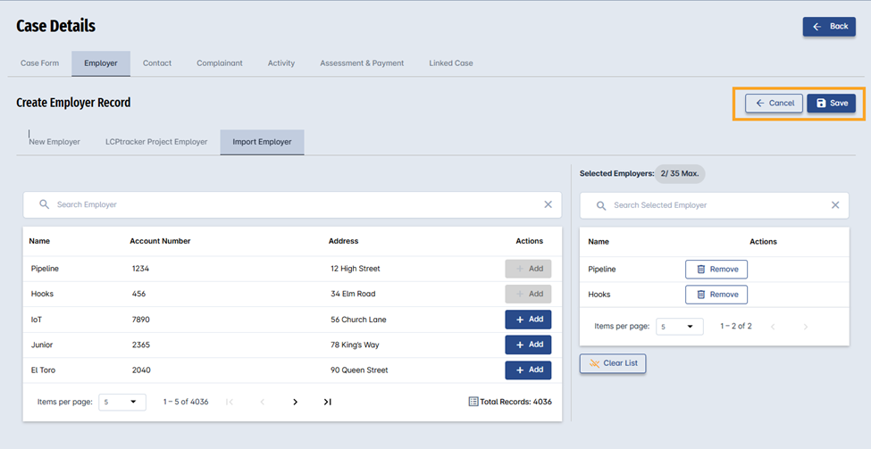 Once the desired Employers have been selected, the user can click the Save button to add them to the case. If the user decides to cancel the operation instead, they can click the Cancel button to discard the selection and exit the process.