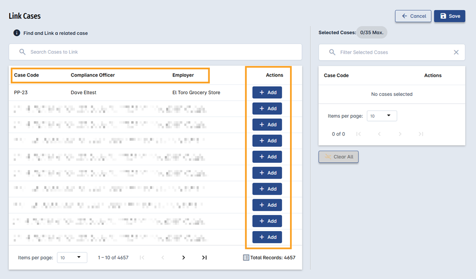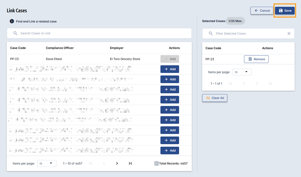 Once the desired Cases have been selected, the user can click the Save button to link them to the case. If the user decides to cancel the operation instead, they can click the Cancel button to discard the selection and exit the process.