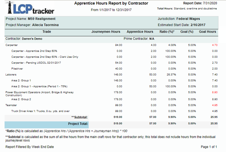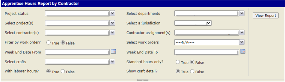Descripción del Informe: este informe categoriza todas las horas, tanto de oficiales como de aprendices, trabajadas por contratistas específicos según los parámetros elegidos en el informe. Incluye los siguientes valores: