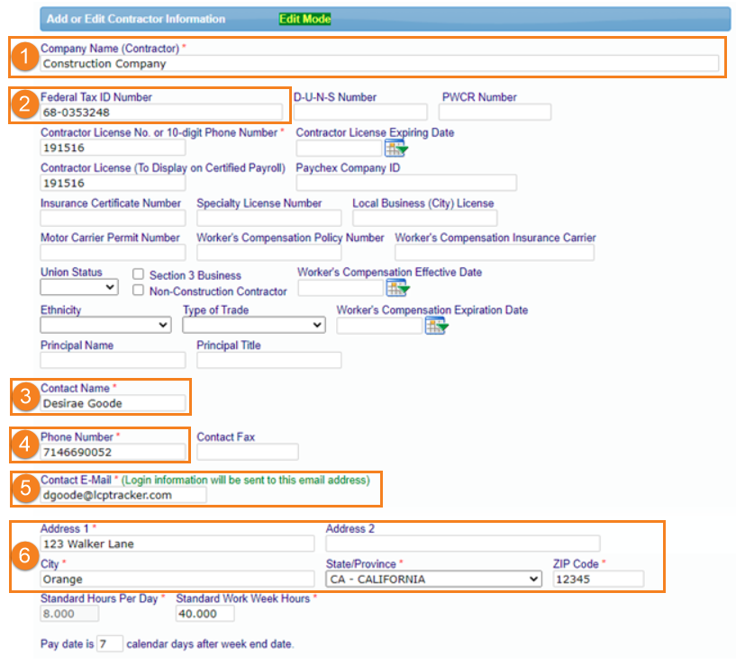 Verify that the following fields have been entered properly into LCPcertified for your account. These will be submitted to the Illinois Department of Labor.