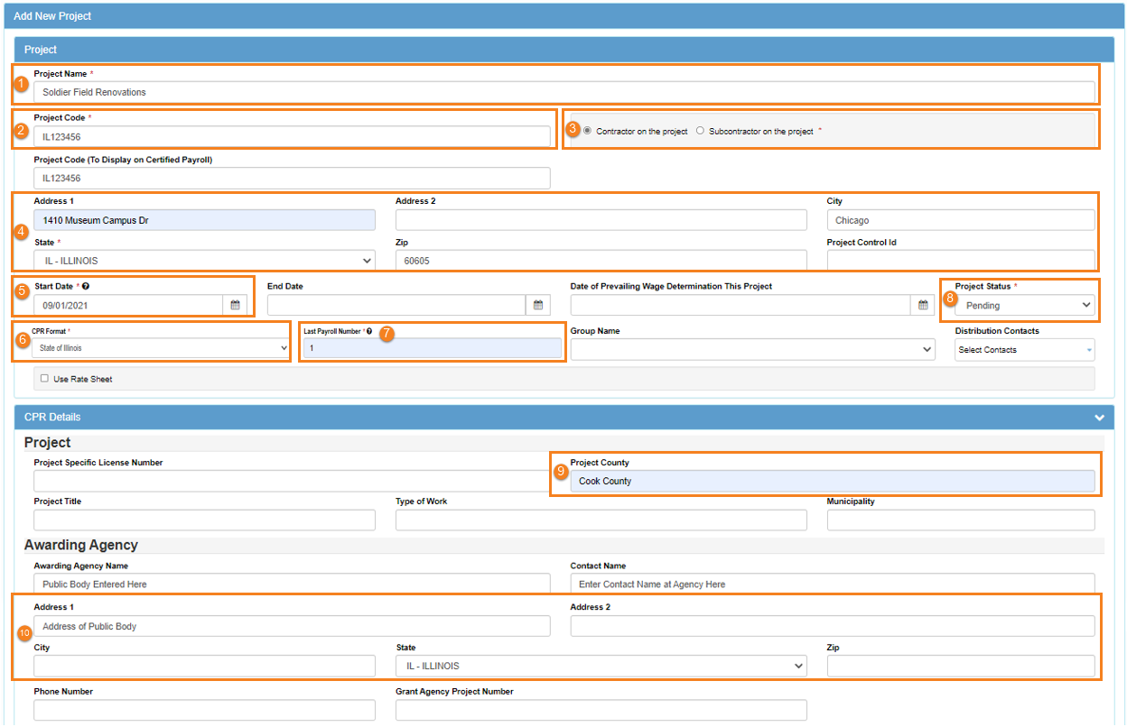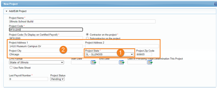 - Enter or update the Project Address and verify that it is a valid, deliverable address by USPS and select IL- Illinois for Project State