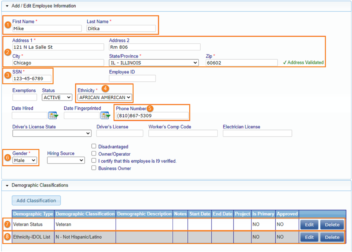 The following fields in the Employee Set Up page are required to upload your payroll files into the IDOL Certified Transcript of Payroll Portal. This information is required by IL State legislation. See the law, 820 ILCS 130/0.01-12 (Legislative Website).