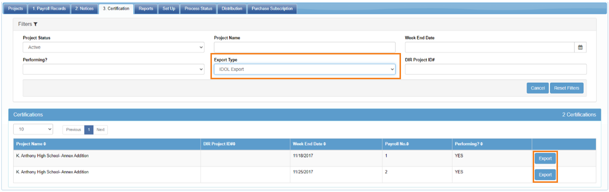 Go to the 3. Certifications>Export Certified Payroll Report. Use filters as necessary and then select the Export Type to ‘IDOL Export’.
