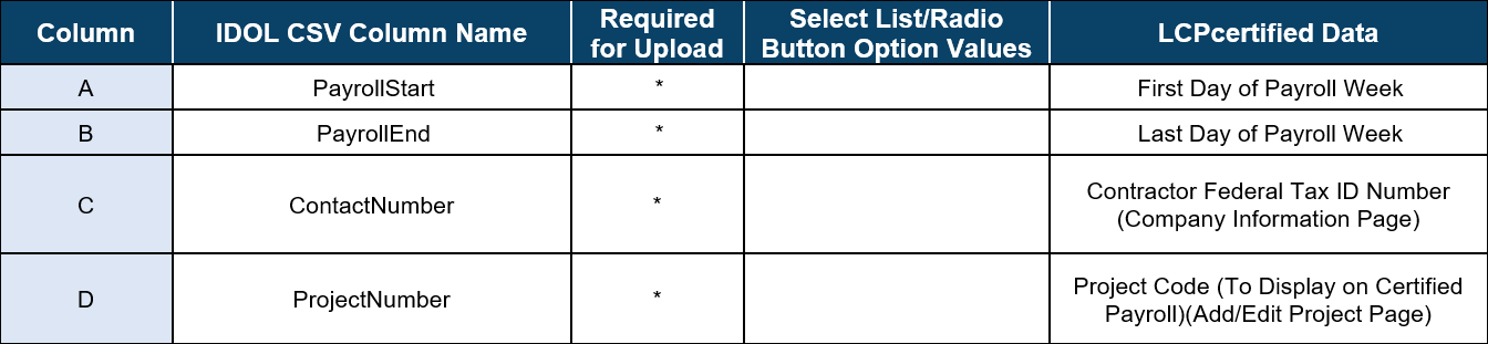 There is information required by IDOL that historically has not been collected in LCPtracker. By following this guide and making sure the information that is collected within LCPtracker is entered, Contractors will be able to meet the minimum required fields by IDOL to be able to upload their payroll file.