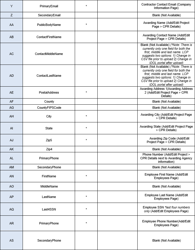 Q, S, T, U | Contractor Address, City, State, and Zip | If these fields are empty in your export file, OR if the address is not valid in the USPS database, the IDOL portal will not accept the file. | |
