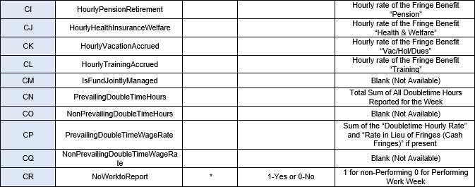 BI – BZ | Total Prevailing and Non-Prevailing Hours Worked | Prevailing Hours are pulling from the CPR entry for the payroll week. Non-Prevailing hours are not available in LCPcertified and will need to be manually entered. | |