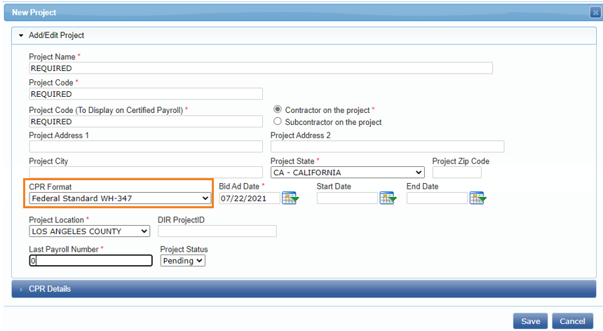 All fields with a red asterisk (*) are required, all other fields are optional. The CPR Format option is on this screen, choose the proper form depending on the project requirements (depending on location, there may only be one option). The CPR Format can be edited if the wrong option is selected.