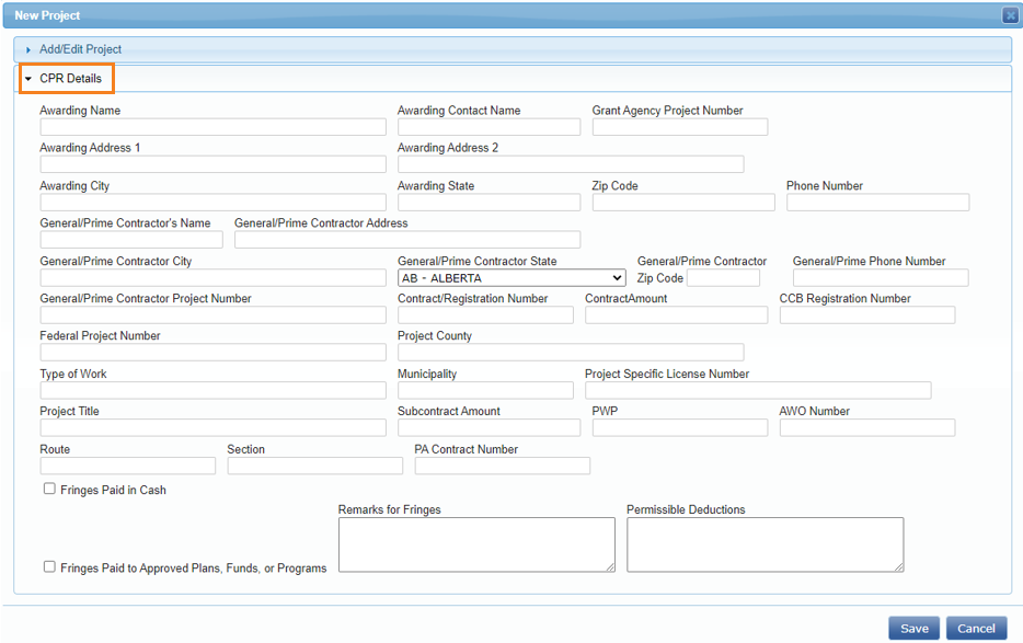The CPR Details tab is optional additional information that can be filled out for a project, this information is also editable after the project is created, if needed.