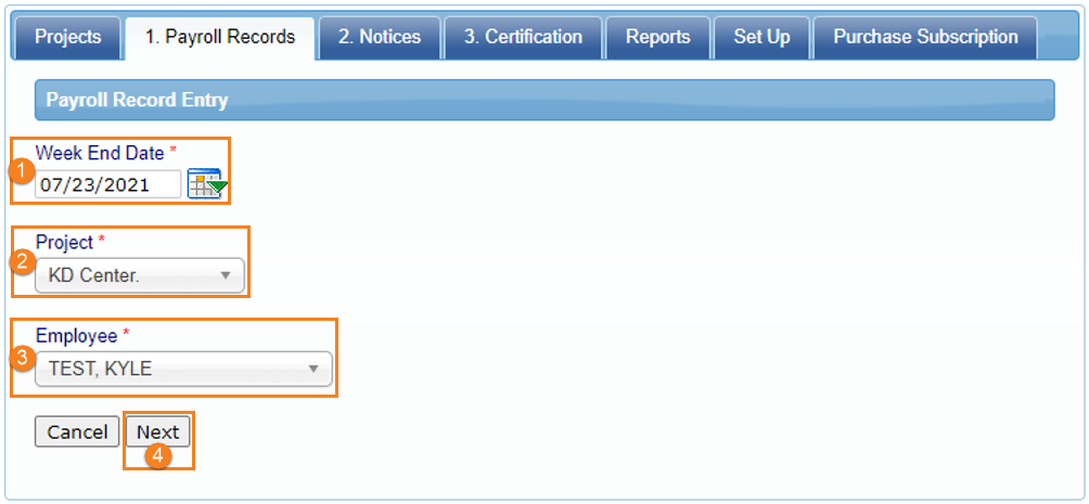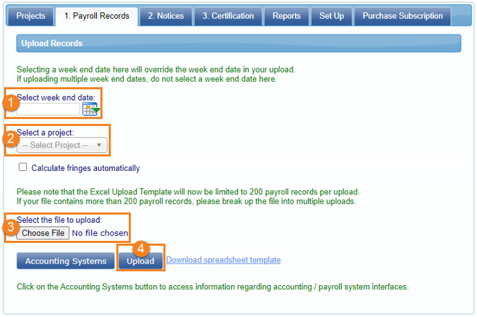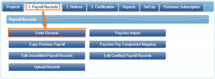After a project has been successfully setup payroll records can then be either uploaded or manually entered. Below are steps to complete an upload or manual entry.